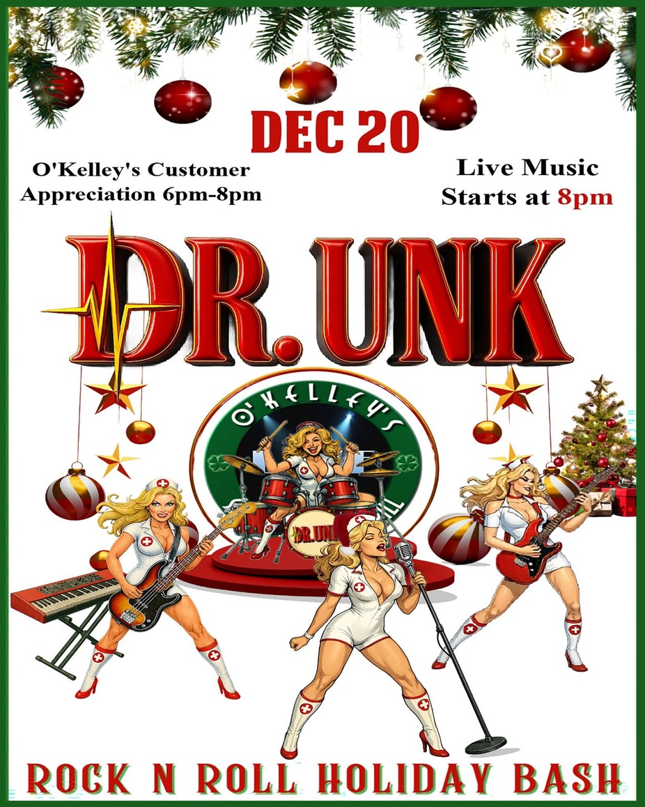 🎉 Customer Appreciation Party & Live Music at O’Kelley’s! 📅 Saturday, December 20th 🕕 Customer Appreciation Party: 6–8 p.m. 💲 $3 You-Call-It Drinks 🍝 Free Spaghetti Dinner — until it’s gone! 🎸 Live Music with Dr. Unk ⏰ Band starts at 8:00 p.m. Join us for an awesome night of great food, killer drink specials, and live music! Come celebrate with us, enjoy the fun, and make it a night to remember at O’Kelley’s!