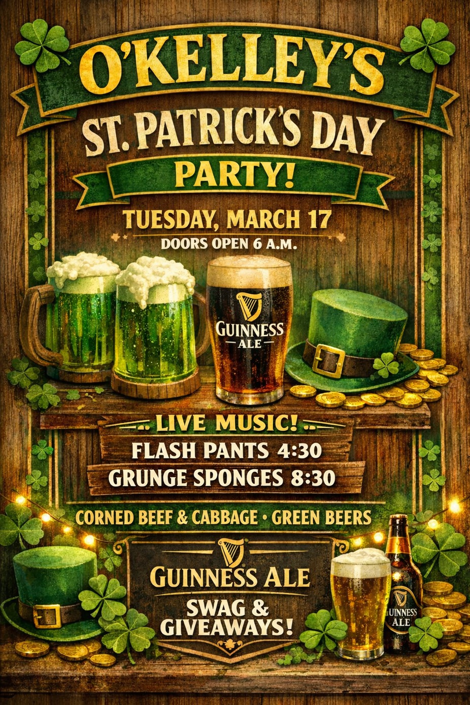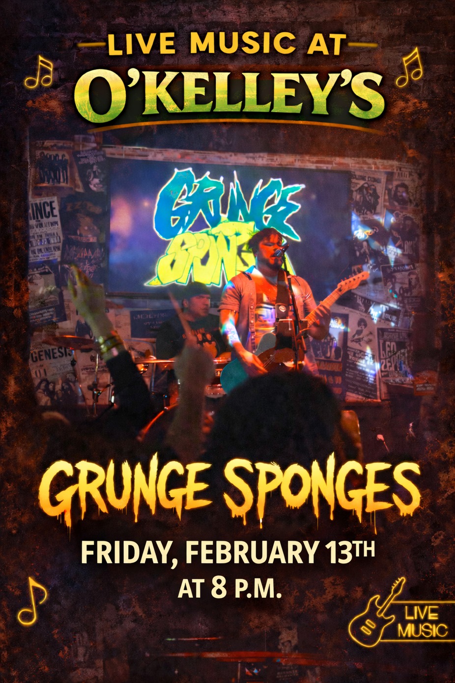 🍻🎶 Live Music at O’Kelley’s – February 13th! 🎶🍻 Come on down to O’Kelley’s on February 13th for live music with of our favorites Grunge Sponges! Enjoy drink specials, dinner specials, and dancing all night long. Great tunes, great food, great vibes—don’t miss the party! 💃🕺