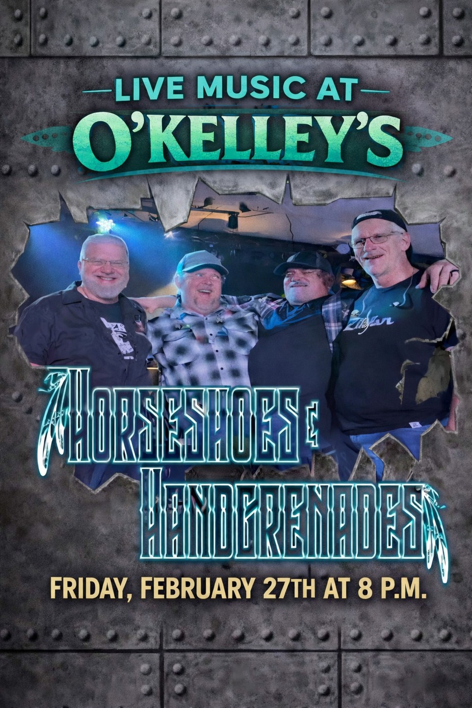 🤠🎸 A Little Bit Country, A Little Bit Rock & Roll! 🎸🤠 Get ready for a fun one with Horseshoes & Hand Grenades on Friday, February 27th at O’Kelley’s Sports Bar & Grill! Dance all night, enjoy the tunes, and sip on $7 Jamesons or Green Teas. Great music, great drinks, and a great crowd—come down and join us for an awesome night!