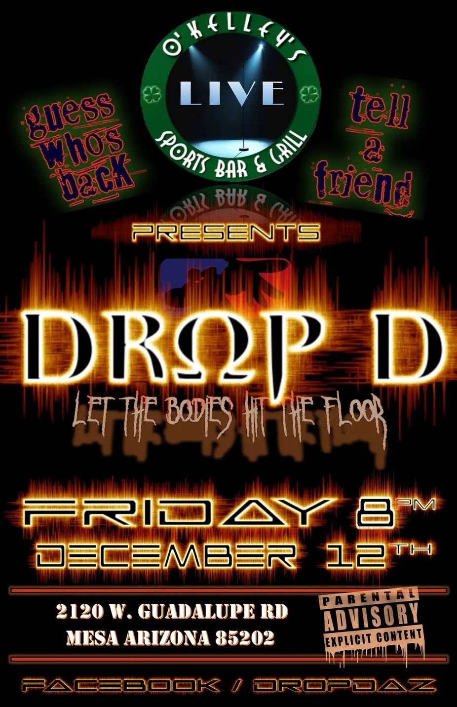 Live Music at O’Kelley’s Sports Bar & Grill Drop D – Straight from Tucson! Friday, December 12th Show starts at 8:00 p.m. Get ready for a killer night of hard and heavy music as Drop D takes over the stage at O’Kelley’s! Bring your friends, grab a cold drink, and enjoy an awesome evening of live music.