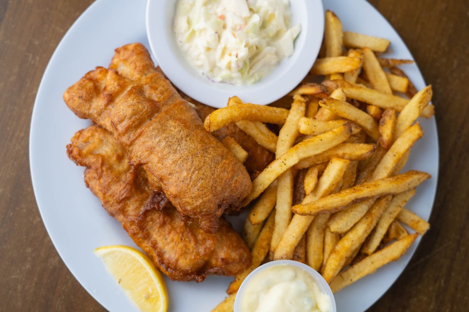 O'Kelley's homemade Guinness beer battered cod, served with fries and coleslaw $10.99.